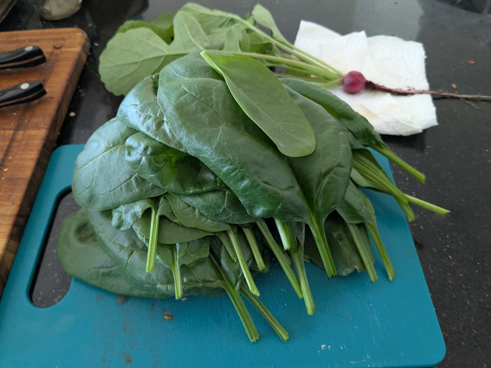 In the meantime, it’s flipped from babying-the-plants time to eating-out-of-the-garden time almost in an eyeblink. I spent a good chunk of yesterday afternoon weeding, checking in, and replacing some of the seeds that didn’t sprout, or seedlings that didn’t handle the cold well. And with the detritus clear, it was reasonable to cut all that spinach; I can probably start harvesting some red cabbage leaves and kale as soon as I want to eat them. I’ve already been dipping into the arugula planter for sandwiches, and the radishes turned out a little meh, but the greens will make a nice stirfry. I didn’t even notice us getting here, and we’re here: One-metre diet season until further notice.