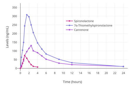 If you decide on using spironolactone, it may be beneficial to split the dose in half and take it twice a day, as it reaches peak effectiveness within the first two or three hours (as shown in the above chart) and then rapidly decreases.