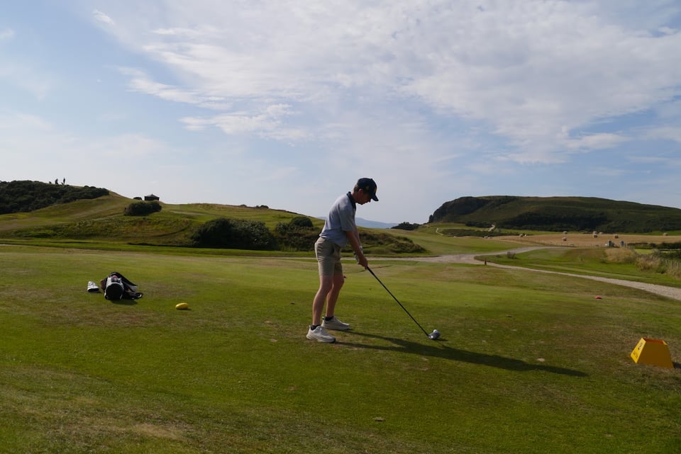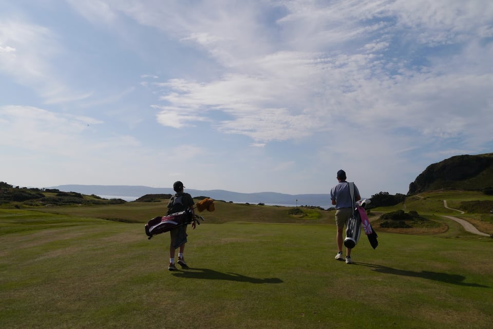 Our first round at Shiskine with all three of us was dampened not by the weather but by navigating a suddenly busy twilight tee sheet with members and visitors. Fraser was tasked with managing his own bag for the first time which would, in theory, allow me more time and space than at home.