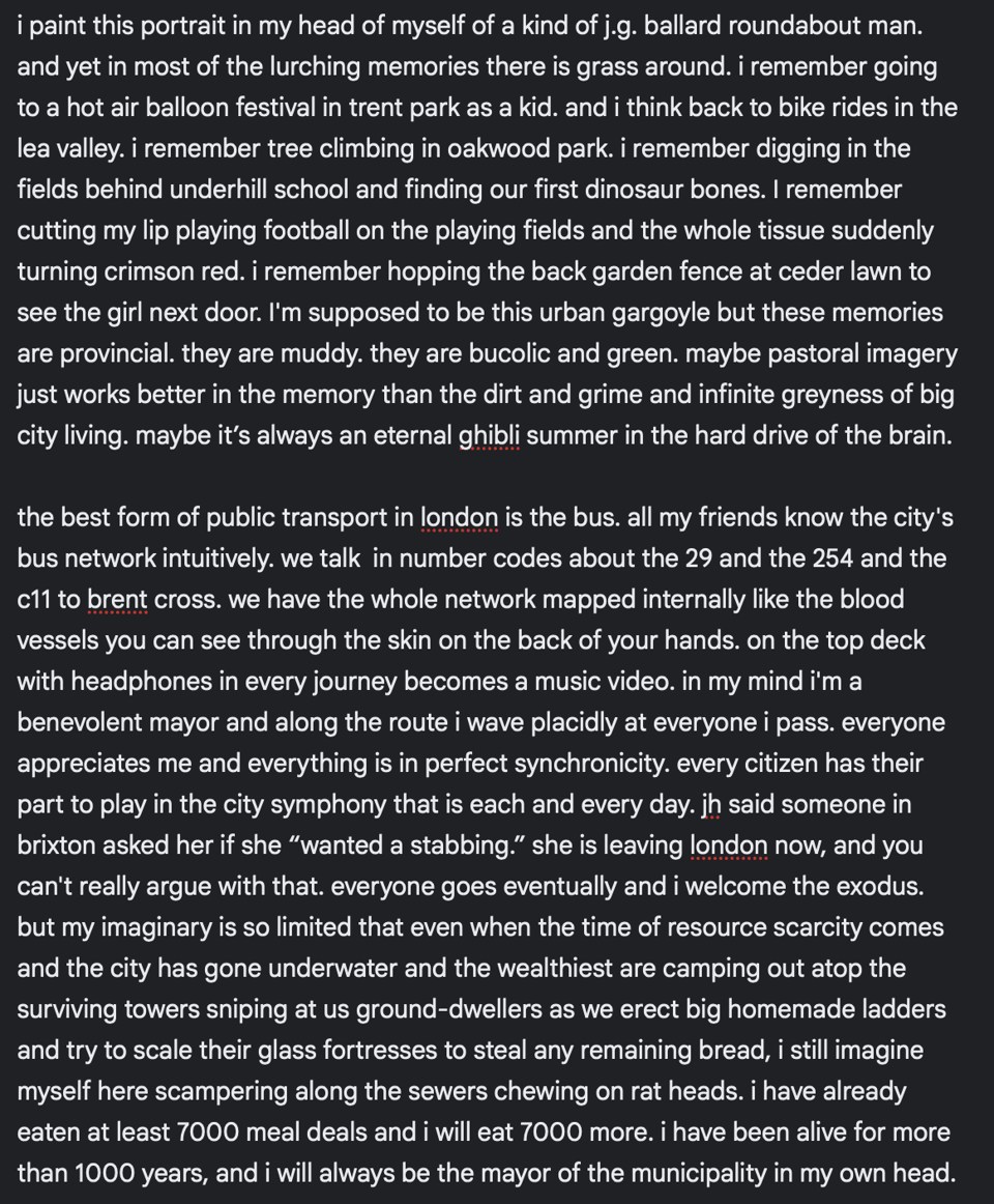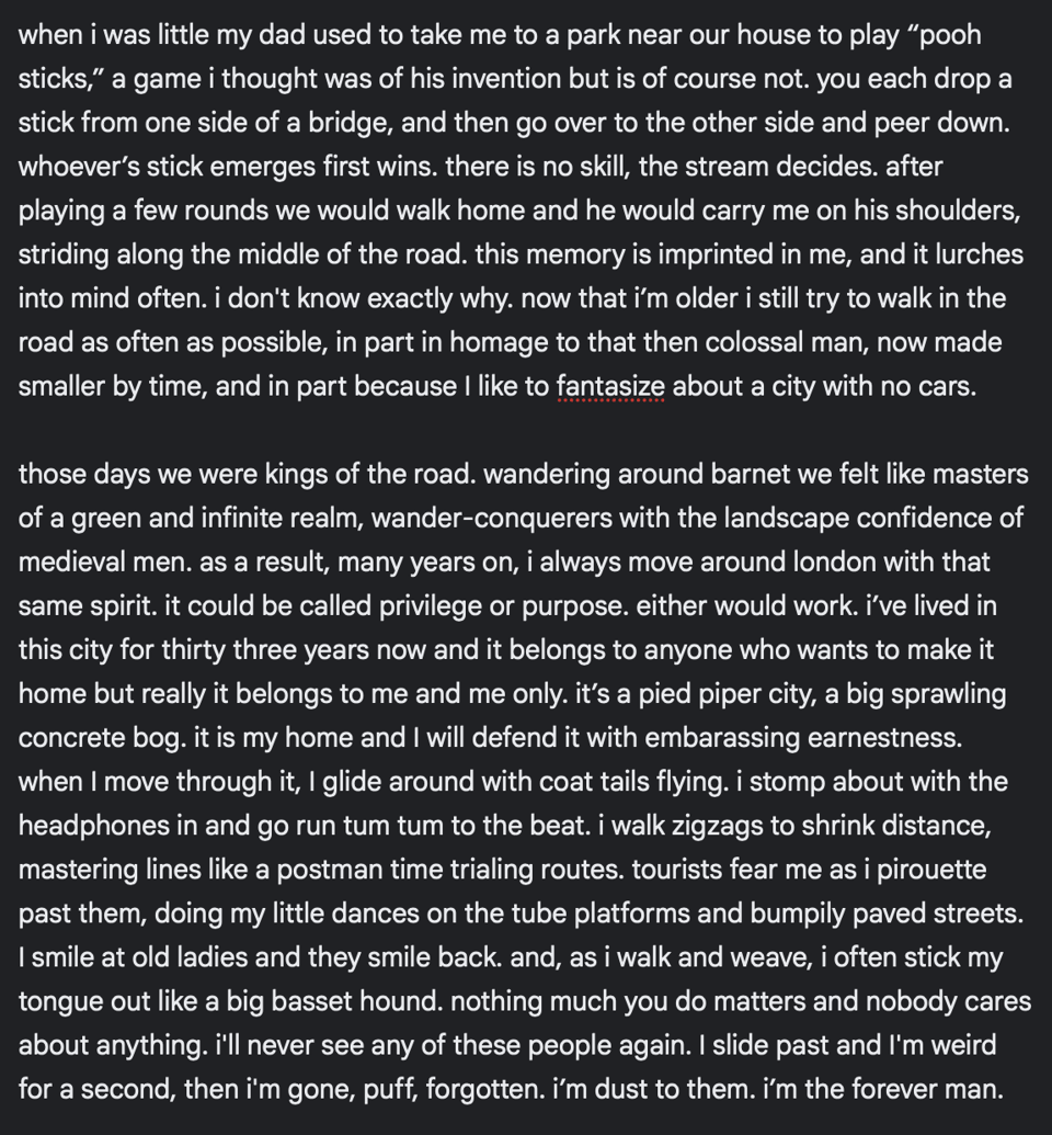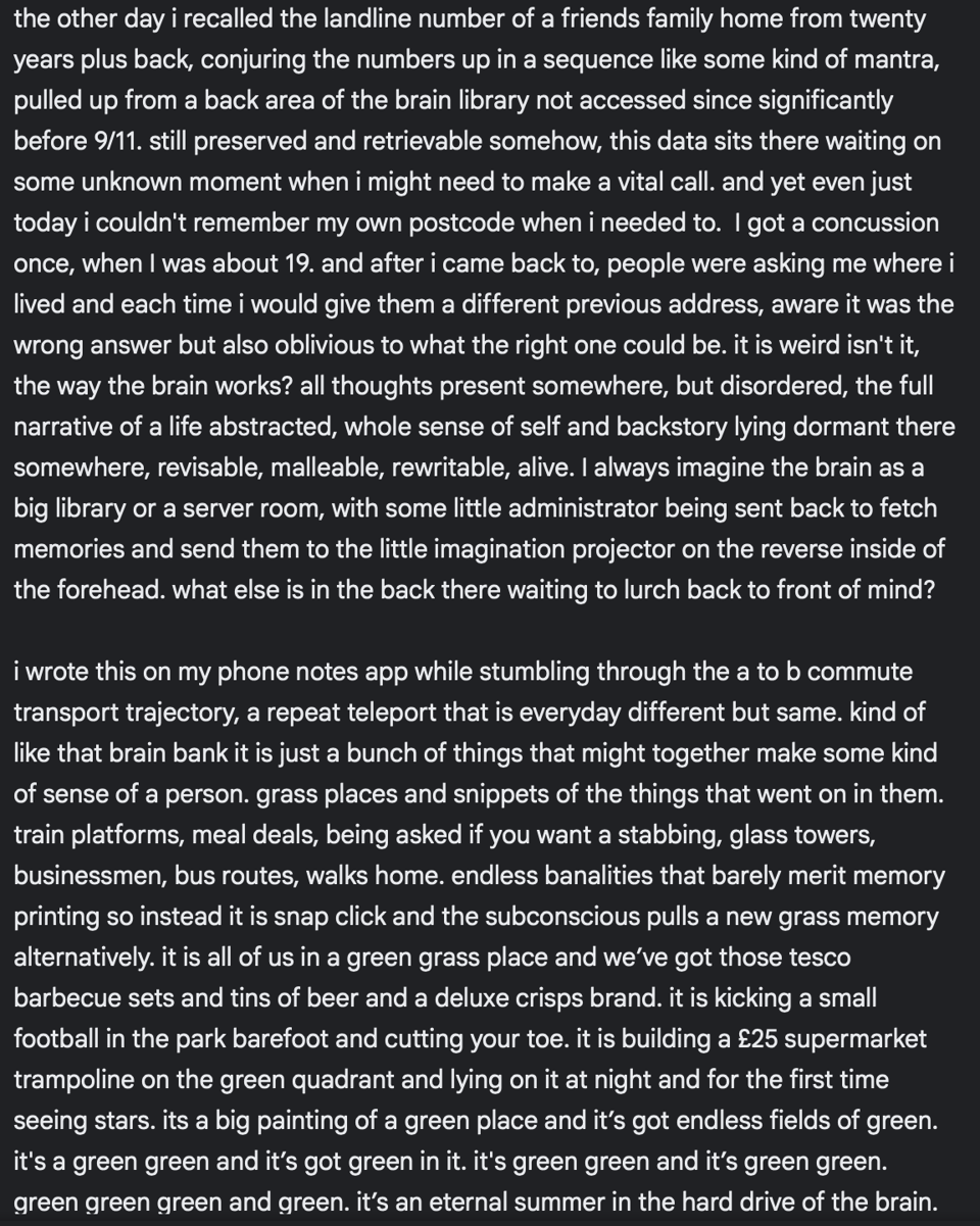 I wrote the below on the notes app of my phone in fits and starts on public transport over the last month or so. By fiddling away at it, cutting and adding bits, moving things around, I thought it might become something. It never quite cohered, but there is still something about it that I like, so I’m sharing it here as a way of letting it go. I've included it as screenshots from the desktop web app version of the notes software because the nice dark mode aesthetic makes it look more interesting somehow.