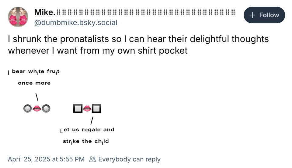 I wanted to make a newsletter because I often have more to say about pronatalism than will fit in a Bluesky post. It seems like it’s only getting worse, what with the pronatalists being fully in charge of the United States of America now. And maybe someday I’ll want to write a book, and it would be good to have a record of stuff I’ve already written. Anyway, here we are, together, yelling.