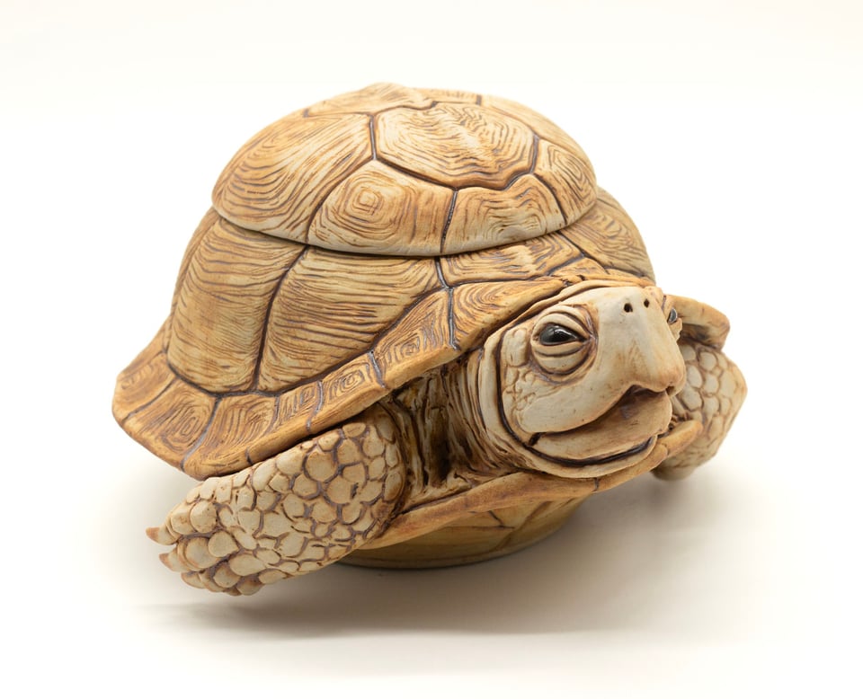I rarely sculpt anything that’s anywhere close to larger than life (I can fit four of the mini vases into this box!), so even though tortoises around the world obviously can be much bigger, the box turtles I based this on tend to stay smaller than this sculpt. The scale gave me a chance to really get lost in the details, and I’m very pleased at how the iron oxide wash picked up all the texture.
