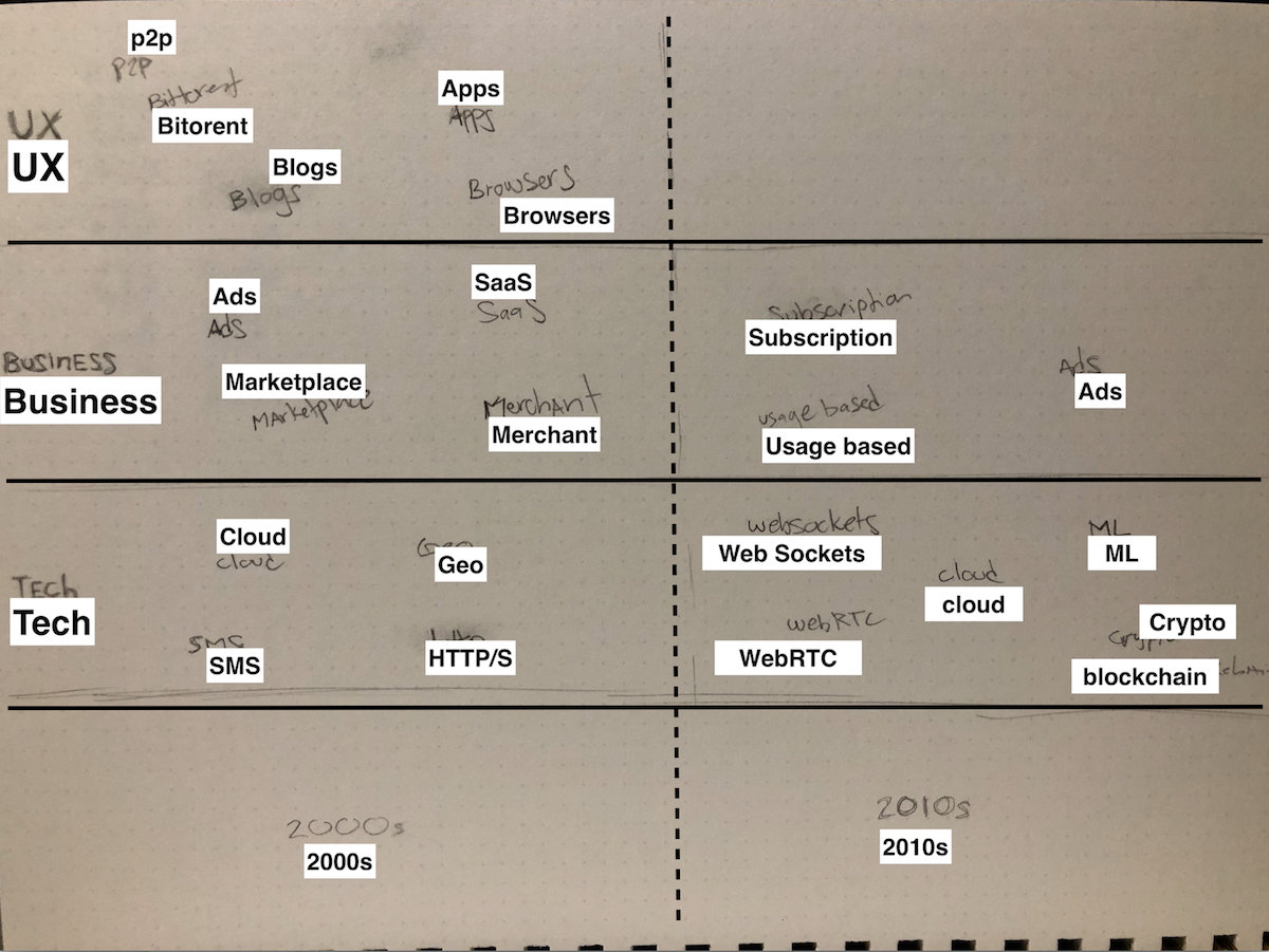 There's been a lot recaps (still) about the last ten years I've stumbled upon ending the new year. Many discussing how tech has changed society and our lives in ways we never imagined. Some I agree with, some I think it's too early to tell. One experiment I've been toying with (besides this newsletter) is to try and sketch out my thoughts in random/creative ways. Here's my first one where I thought: "What new user experiences / businesses / tech came about in the 2000s vs the 2010s?" It's not complete, but it's a rough attempt to try and understand progress we've witnessed. What prompted me was this oral history of Limewire.