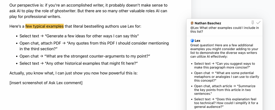 By the way, I still send drafts to colleagues and friends! Human feedback is irreplaceable. We’ve put a lot of effort into making Lex great for collaboration, with more coming soon.