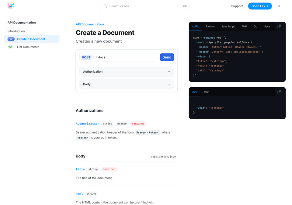 To get started, head over to our documentation at https://docs.lex.page.