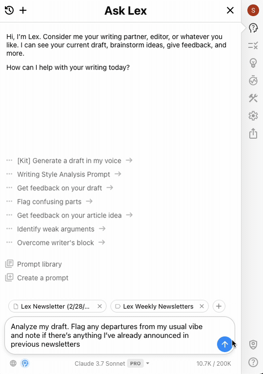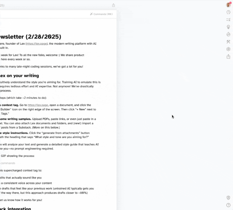 Attach some writing samples. Upload PDFs, paste links, or even just paste in a ton of text. You can also attach Lex documents and folders, and (new!) import a bunch of posts from a Substack. (More on this below.)