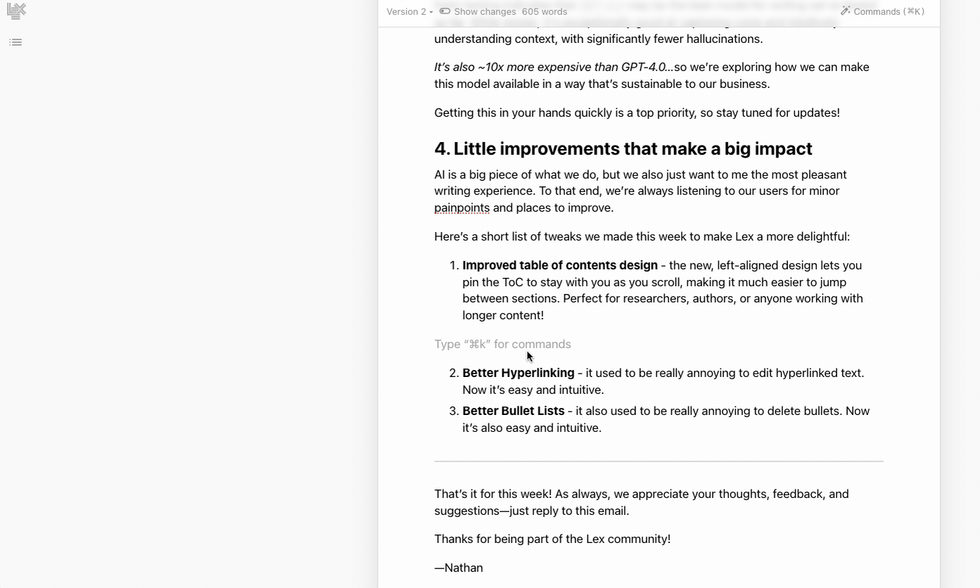 We want Lex to be the best place to write, beyond AI innovations. To that end, we’re always excited to announce minor improvements that make spending time in Lex more delightful (and less frustrating).