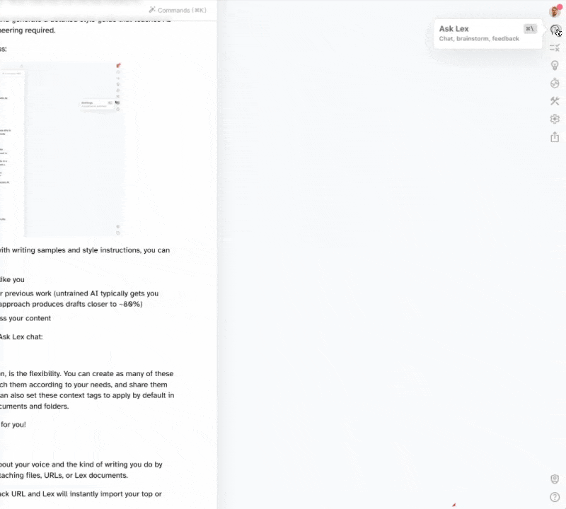 In minutes, Lex will analyze your text and generate a detailed style guide that teaches AI how to write like you—no prompt engineering required.