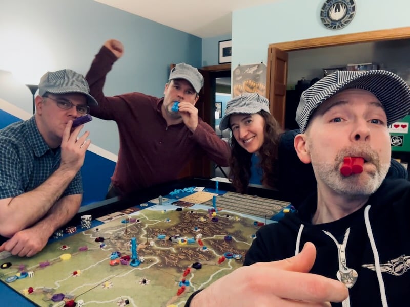 One of my dumb ideas was to have a campaign of one of my top 10 board games, Railways of the World, where we would travel the world via the many maps available for the game. We have a highly custom version of the game with a bunch of 3d printed things because I love it so much. I made it a tournament with some Mario Kart-style scoring and was off.
