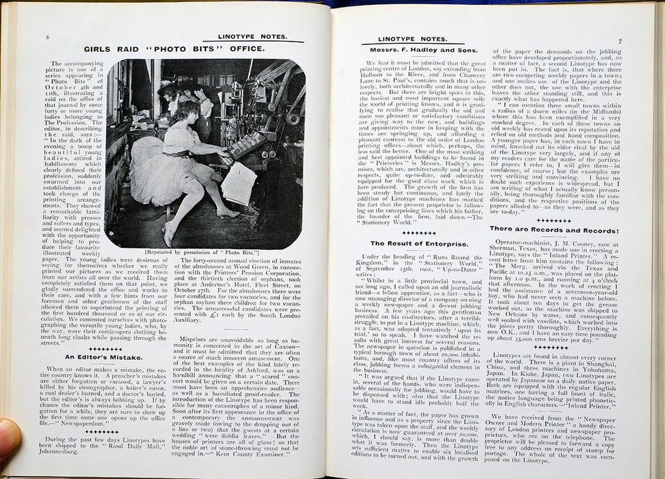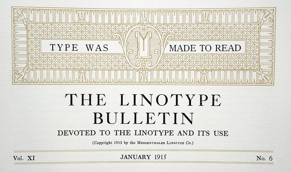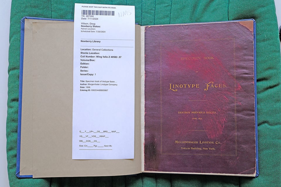 The library contained many rare books, including the oldest known specimen from the Mergenthaler Linotype Company — June, 1896! As with any company starting up, the specimen book was a fairly thin, but it was exciting to discover and document.