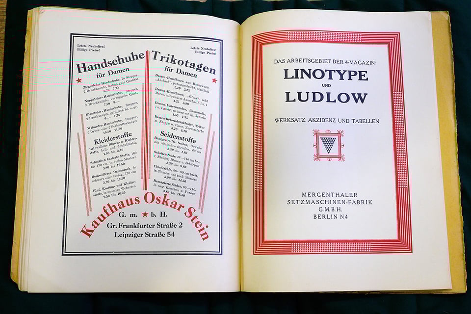 Another piece that was exceptionally interesting was a large booklet which promoted both the Linotype and Ludlow machines in Germany. I’ve known for a long time that Ludlows and Linotypes were complementary machines in many print shops (with the Linotype doing the body copy and the Ludlow doing the headlines and subheads) but at least in the United States, these were never jointly promoted since they were separate companies that even competed at times.