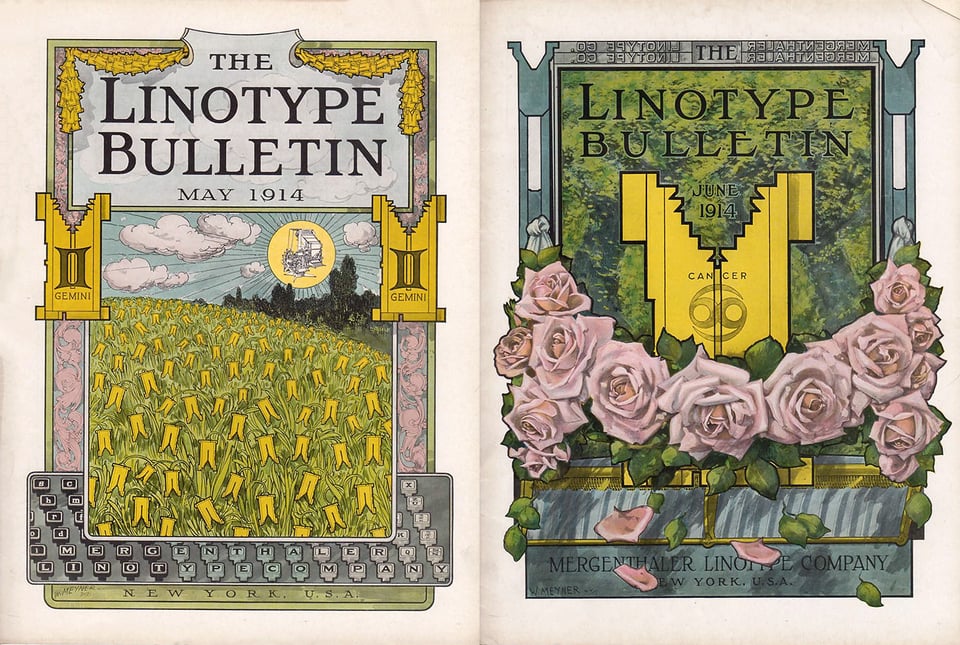 That evening I was shown the above cover from March 1914 based on Aries and it absolutely blew my mind. The ram head made of Linotype matrices! The horns constructed of Linotype slugs! The giant spacebands framing the ram! The cherubs in the corners blowing the early spring winds! If you can’t tell, it was love at first sight.