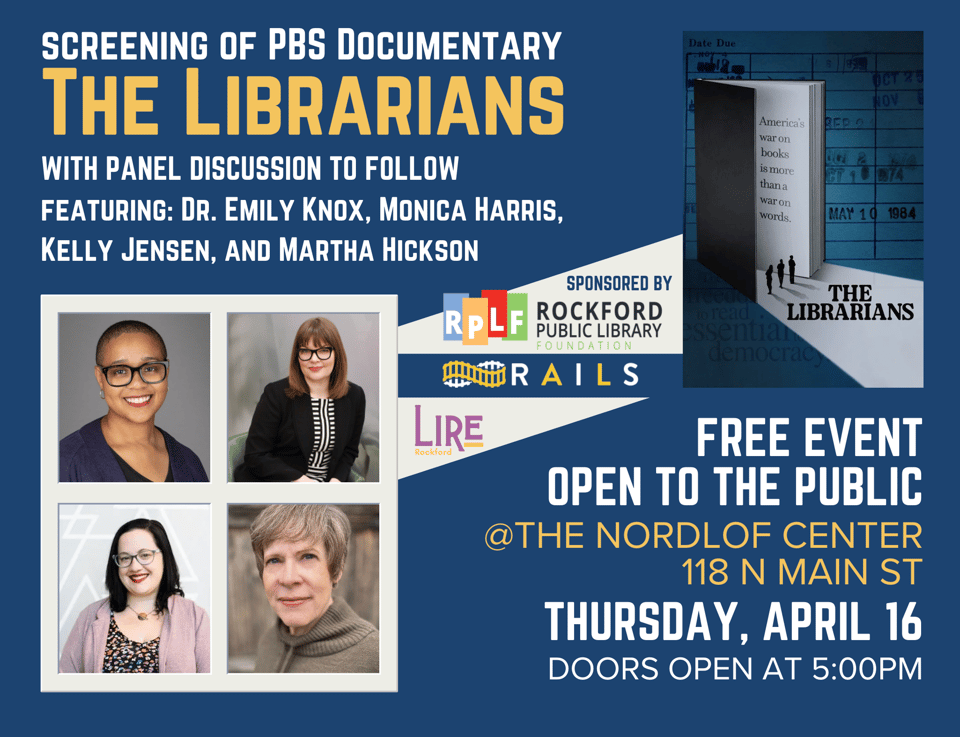 Don’t forget to add Lire Rockford’s screening of The Librarians to your calendar! We can’t wait to see you on Thursday, April 16 at 5:00pm at Rockford Public Library’s Nordlof Center in downtown Rockford.