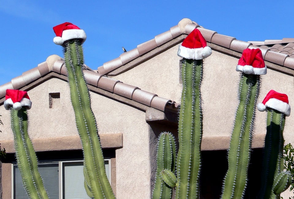But yes, there’s something so weird about stringing Christmas lights on palm trees. Or seeing Santa in a big fur coat in Phoenix, where Christmas is a day on which I tend to push up the sleeves on my lightest sweater around noon. Compare that to the sense of rightness-in-place I felt this summer when I went on a solstice group bike ride, celebrating the beginning of the sun’s retreat by jumping into a bunch of Tempe fountains.