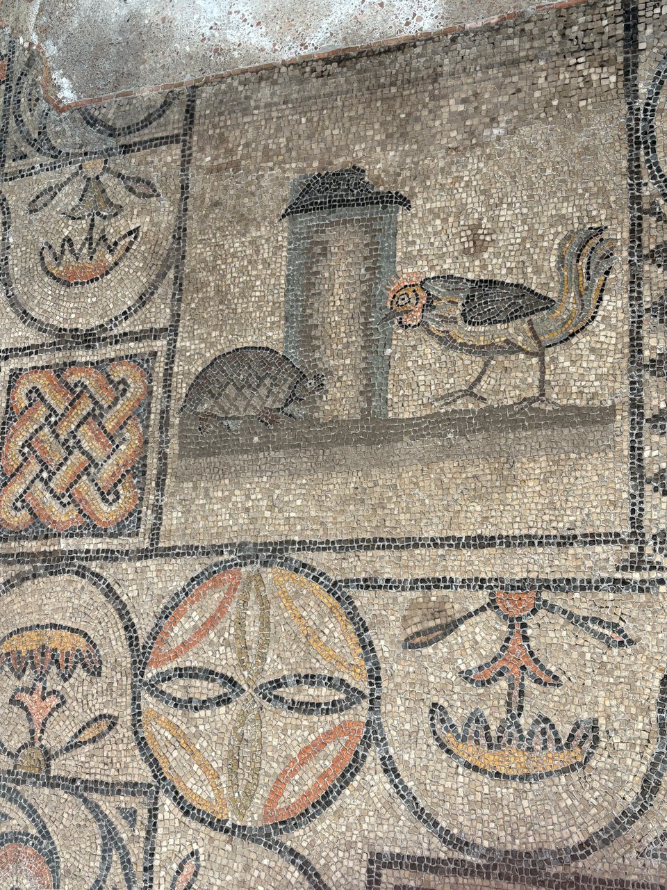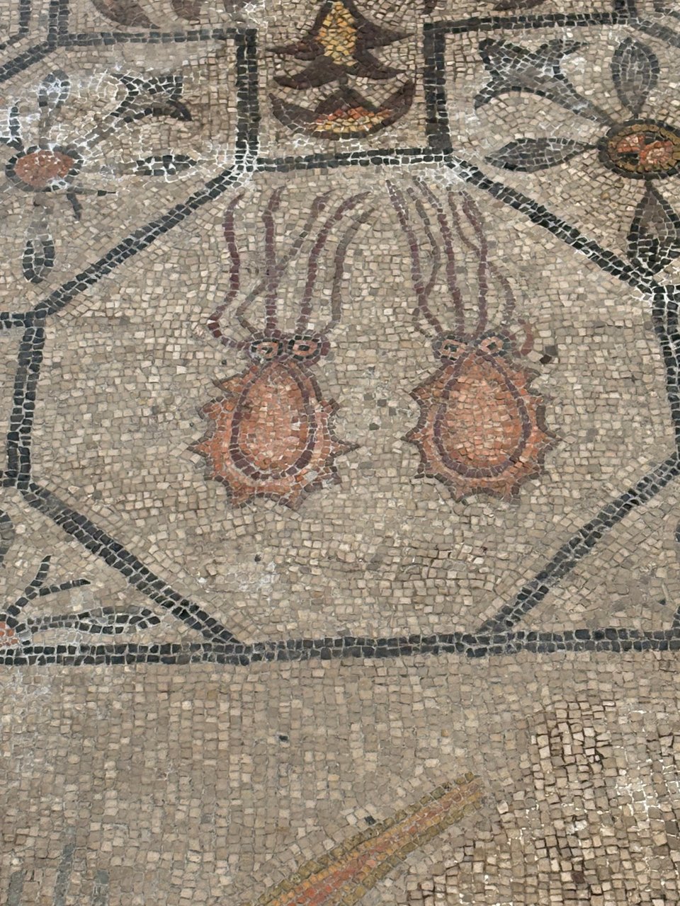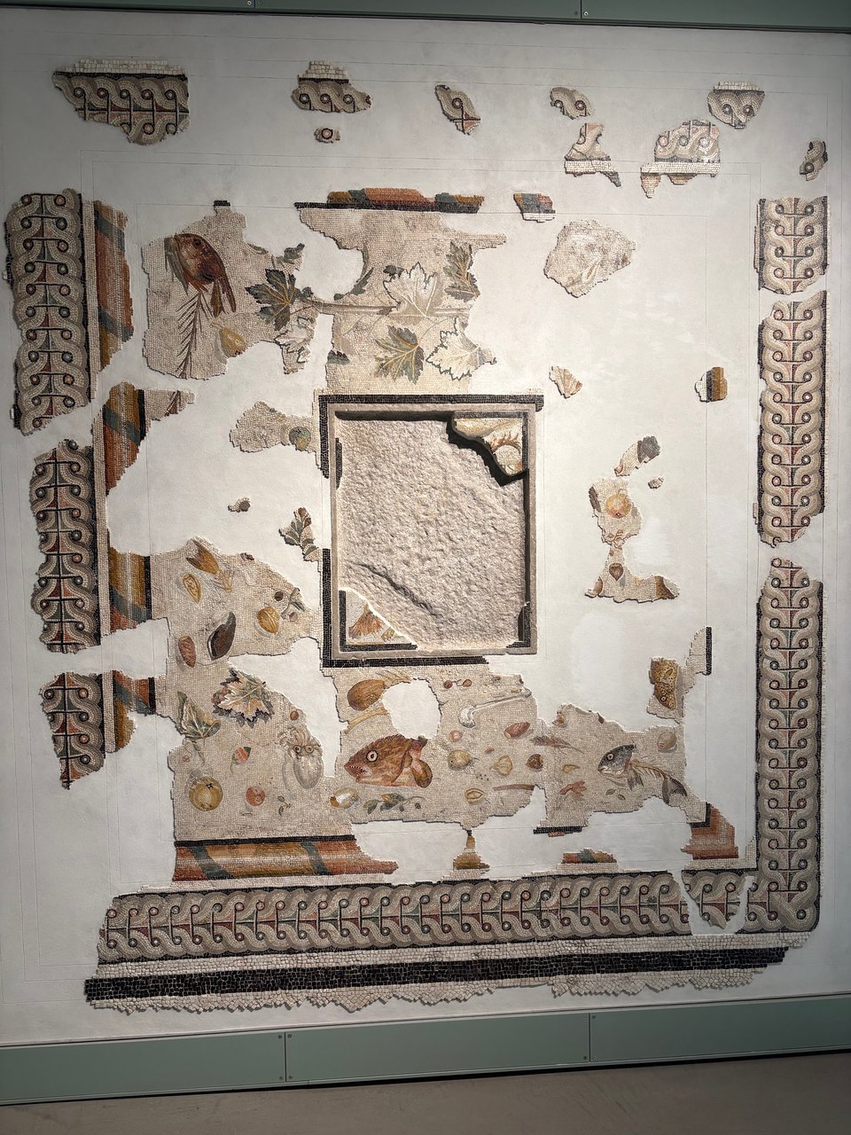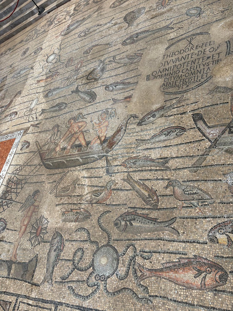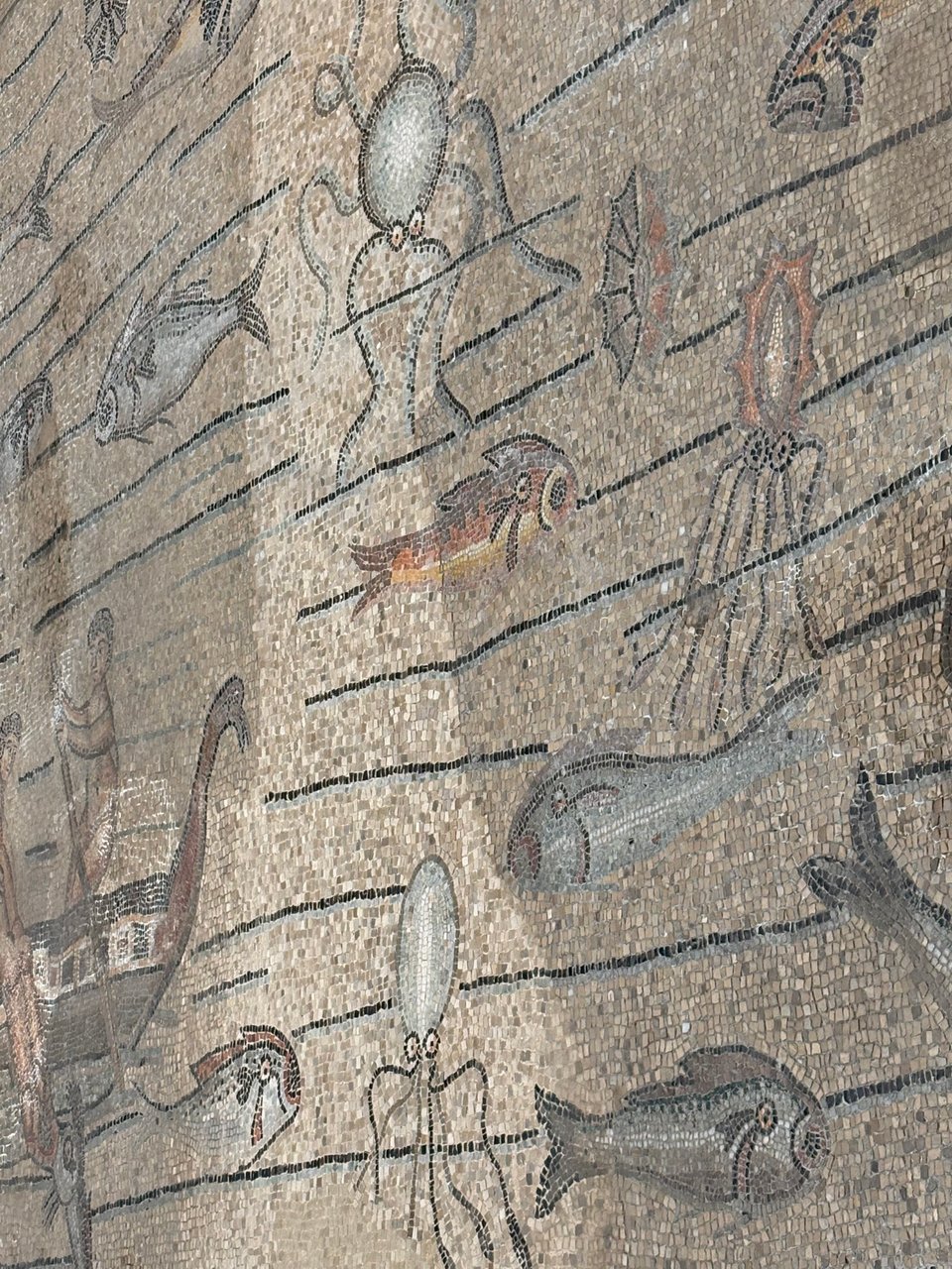 If you look closely, especially at the bottom, you can see this is supposed to be an unswept floor after a feast—the fish heads, the bones, the olive pits. You can also see a squid, which the artists of Aquileia were apparently obsessed with.