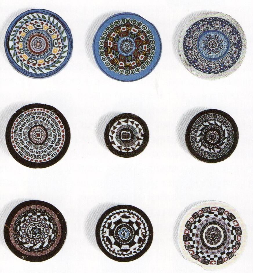 And then. And then! Murrine glass. It was an old technique, made anew in and for a new world. Artisans, adrift and struggling, could make it out of scraps and leftovers, fusing together canes of different colors into dense mosaic patterns and stretching them into long, thin cylinders. They sliced the resulting cylinders into dozens or hundreds of tiny pieces, which they either used like beads or assembled into plates or other shapes. Murrine glass was the opposite of elegant, transparent medieval glass. It was loud, dense, and riotously colorful. It was either haphazardly thrown together or ridiculously over-designed (miniature portraits of the pope anyone?). It was over the top. It was tacky.