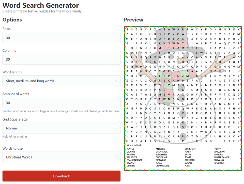 A short update at this hopefully relaxing time of year. Every year I like to make something with a festive theme. Sometimes it’s an online quiz, and this time it’s a word search generator with, you guessed it, a Christmas theme.