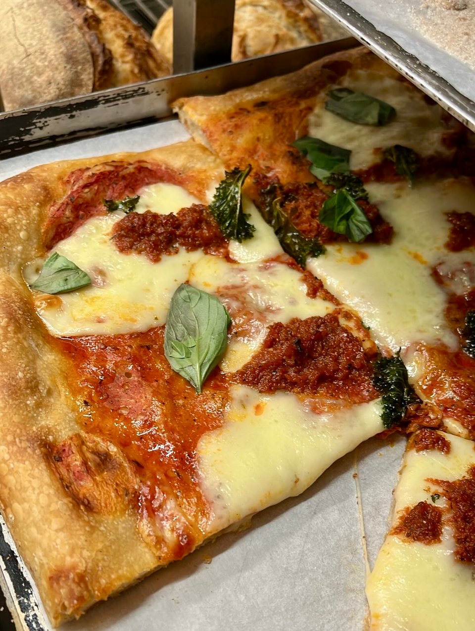 Veggie nduja, kale, basil + mozzarella sourdough pizza