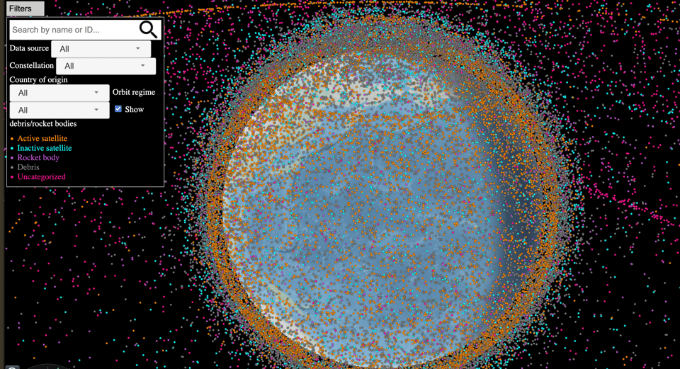 The following images are screencaps of the UT Austin Astriagraph, depicting low earth orbit without, and then with the trash halo of space debris.