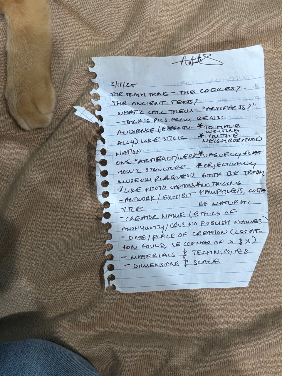 Curatorial Notes: Pictured in the lower lefthand corner is a blue mound — the author’s leg, which he accidentally caught in the photo while distracted by the feline limb occupying the upper lefthand corner. The limb belongs to the author’s six-month-old kitten, “Hobbes,” who seized the document and immediately began to chew on it shortly after the photo was taken.