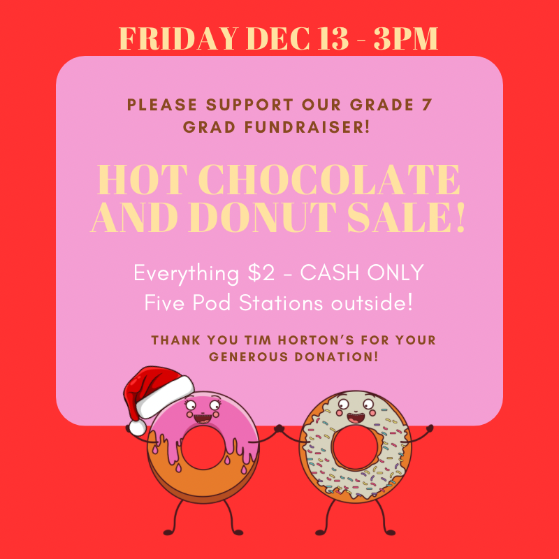 Tomorrow, Friday December 13, is the winter fundraiser for the grade 7 leaving celebrations! There will be doughnutsAa and hot chocolate (conventional and vegan) for sale for $2 after school, Please find more info below!