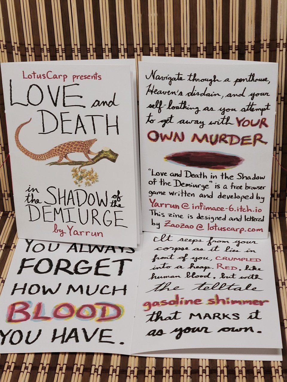 LotusCarp will be tabling at EBABZ for the first time! Most of what I had for BAQZF will return, and we’re also featuring prose/poetry from my dear friend Yarrun for the first time! Here’s a zine based on one of their text-based games: