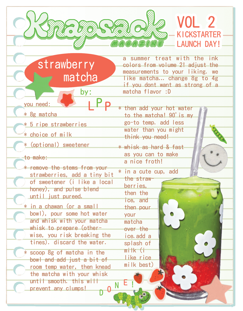 To commemorate our launch, we wanted to include something special in this newsletter to you guys (our faves in the world). We’ve included a Knapsack themed recipe: Pocket’s Strawberry Matcha Latte! We wanted to make something that looked like the volume’s ink colors of redorange and green, lol. Make this drink when you’re feeling like you need extra luck! ⭐