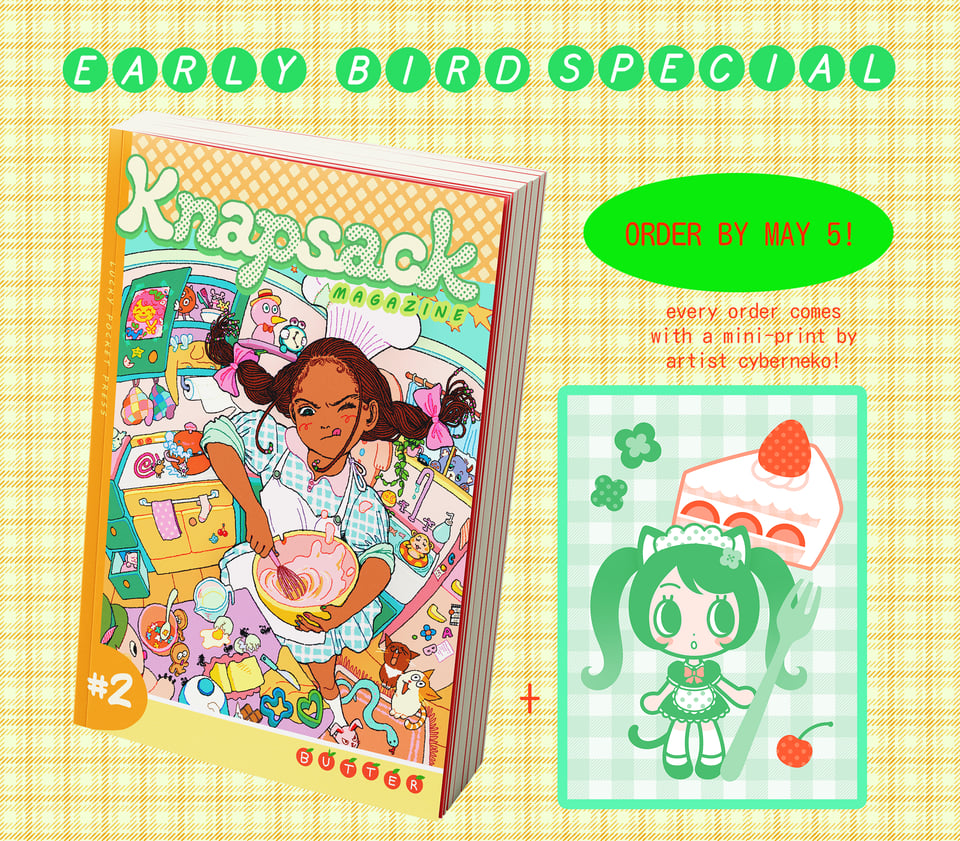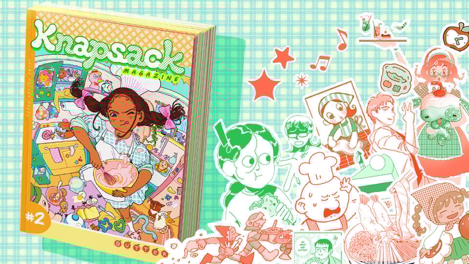 If you are new to our newsletter and haven’t seen Knapsack Magazine yet, Knapsack Mag is our serialized comics anthology series encapsulating our nostalgia for the late 90s and early 2000s comics, with a different theme for every volume. Our first volume, Cassette, was published last year, had over 20 artists, and was themed around music. For our second volume, we’re going for an even bigger book, with 28+ artists and more illustrations, articles, comics, and some cool extras like a tear out recipe card and foldout poster!!!
