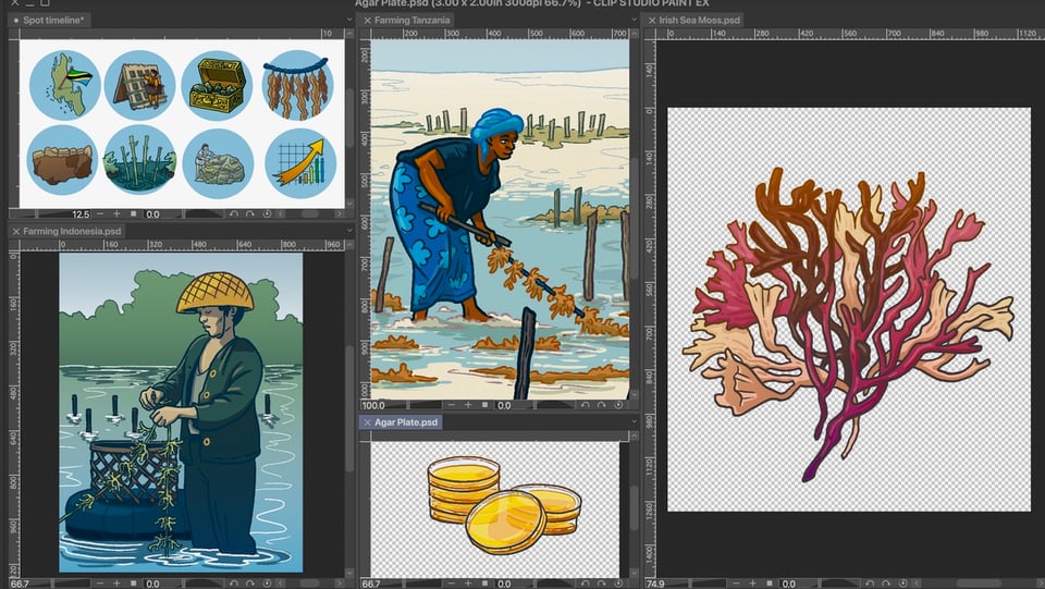 (Some illustrations from the kelp farming primer poster I recently finished.) While my dad was in the hospital I managed to give a really fun talk for the Aquaculture Information Exchange on why cartoonists are singularly well-positioned to do science communication work. (The inciting project for this was a giant poster about kelp farming that I’ve been working on for months and cannot wait to share…soon!) You can watch the talk replay here.