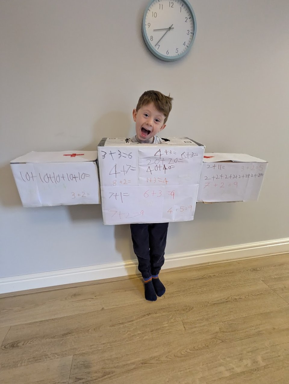 I was up all evening the night before, sellotaping cardboard boxes together and covering them with printer paper so he can decorate them with “number sentences”, whatever they are. When I emerge downstairs after dressing and showering, I find Ted posed in his costume: