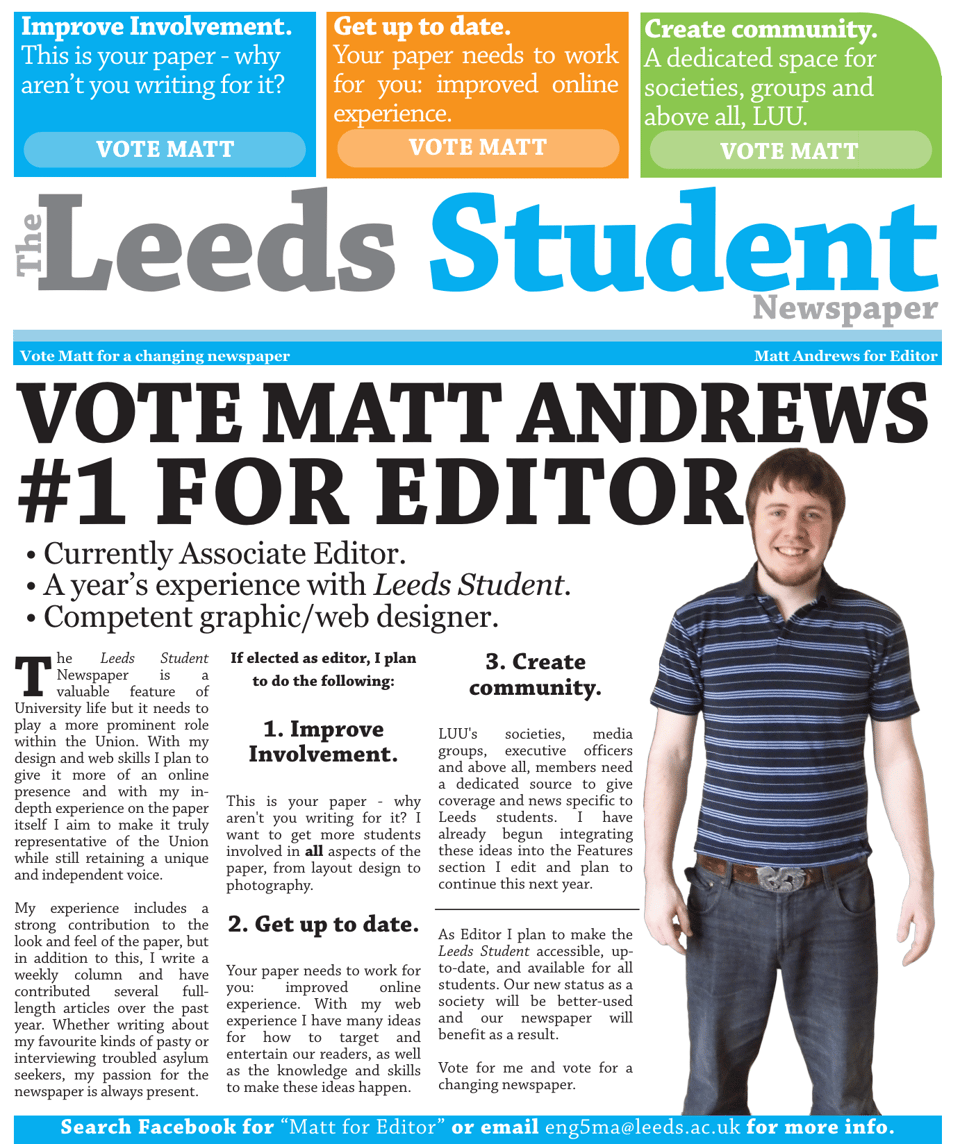 I remember feeling smug seeing my late-submitting friend doing his own campaign around campus: he was wearing a huge cardboard truck around his waist (which related to a pun around his name) and I knew I’d never have gone for something so obvious for my campaign. I’d cleverly made my flyers look like a miniature copy of the newspaper itself, with a whole article (in 6 point font) explaining how I’d modernise the digital production workflow.