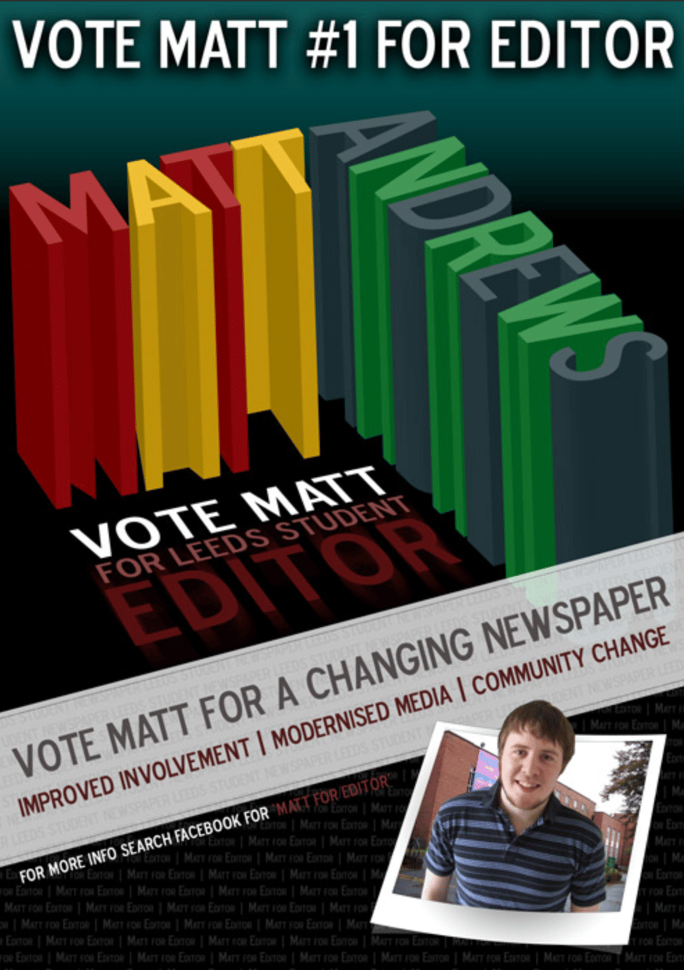 It was a strange situation to find myself in: 21 years old and making posters with my face on, painting banners with “VOTE MATT FOR EDITOR” in huge letters; spending all my non-lecture moments handing out flyers to strangers trying to quietly enjoy a sandwich in the student union cafe; popping into lecture halls to make quick stump speeches before the professor arrived. In retrospect, I don’t know where this confidence and dynamism appeared from, but it was propelling me forward.