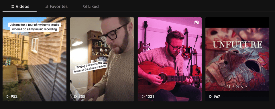 I posted some absolutely innocuous stuff: the album artwork for the new record, a generic “bloke with guitar” photo. I went to bed and woke up to see that both “videos” (I think TikTok somehow magically made them into clips with automatic effects/music…?) had received almost 1000 views. I didn’t even have any followers!