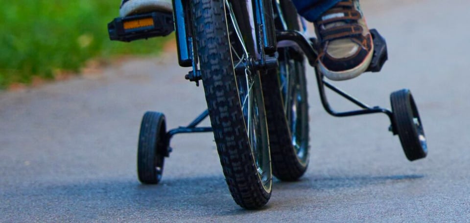 It was an exercise in humility: he immediately wanted to ride his bike again. Watching him make his first tentative movements, I was reminded how many new things he was having to learn: how to brake, how to position the pedals, how to ring his bell while riding, how to step over the frame. The stabilisers at least enabled him not to fall over while he was focusing on doing all these new things.