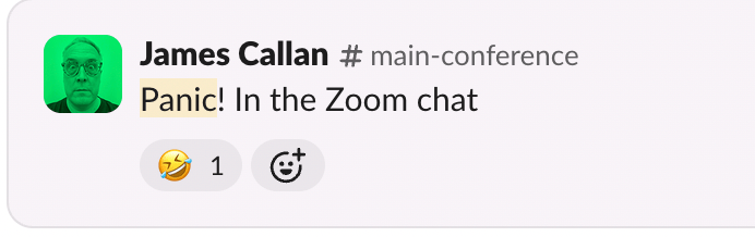Oh fuck. It appears I did not keep my cool to myself. Not at all. I had actually typed “Panic” where all 300+ attendees of the conference could see it. Cool, cool.