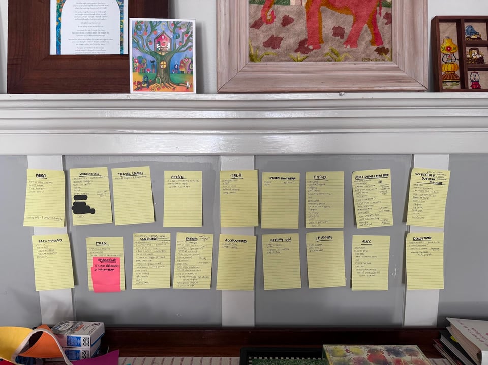 Yesterday, I became possessed with the idea that if I got the tasks out of the computer and into an analog format, all my problems would be solved. The former tenant of our home left a large whiteboard, so I went to the grocery store and grabbed dry erase markers and post it notes. Then I went to town.