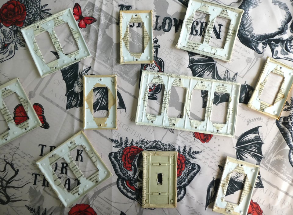 Step 3: Trim the book page to be just ½" larger than the switch plate, cutting off the corners at a diagonal. Wrap the paper around the edges of the plate, securing with more Mod Podge.
