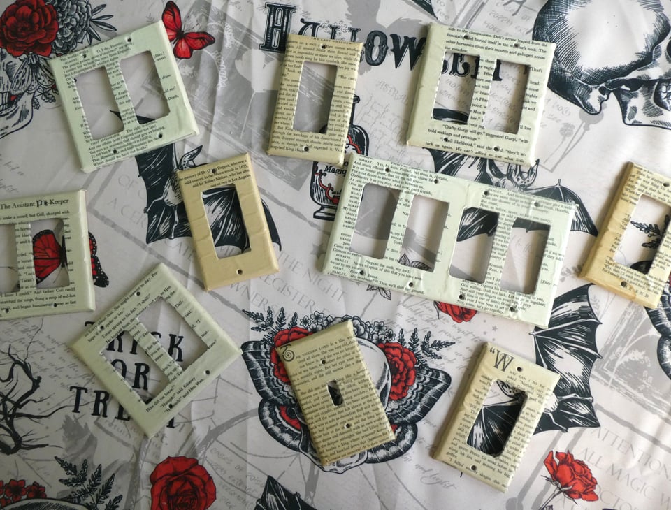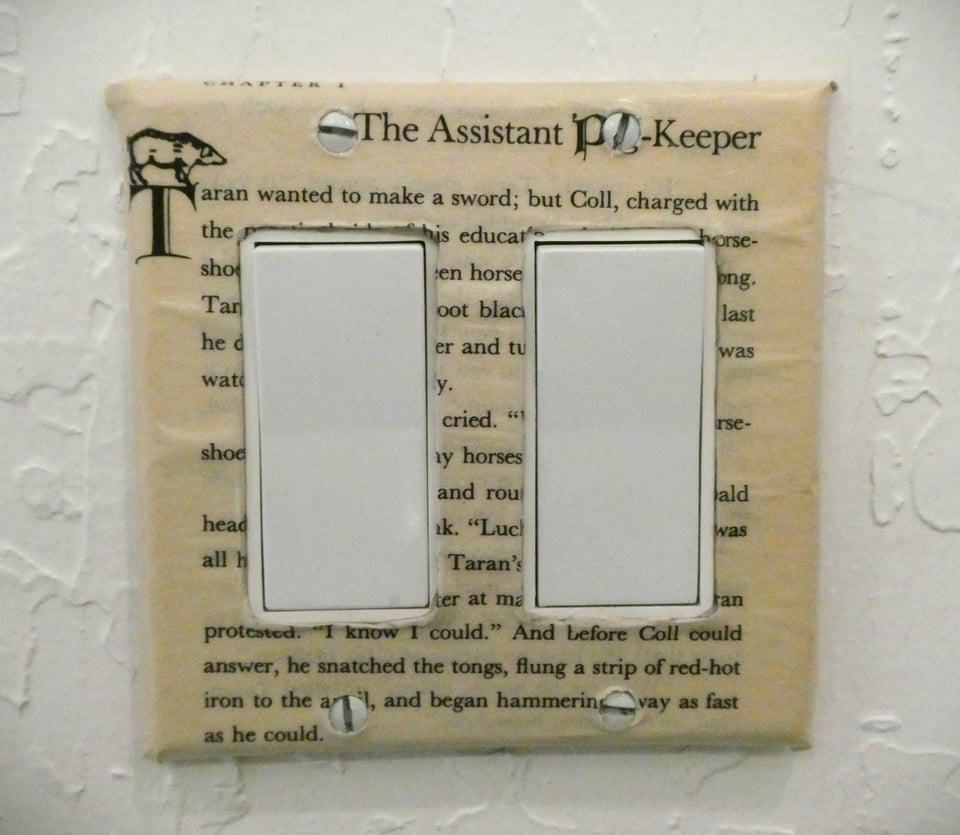 So I got pretty excited when, browsing my local library, I stumbled across The Repurposed Library: 33 Craft Projects that Give Old Books New Life, by Lisa Occhipinti. It’s filled with ideas I hadn’t seen before, many of which I’m eager to try! I thought, though, that I’d start with something simple: book page light-switch plates. It’s the small kind of detail I love that really brings character to a home.