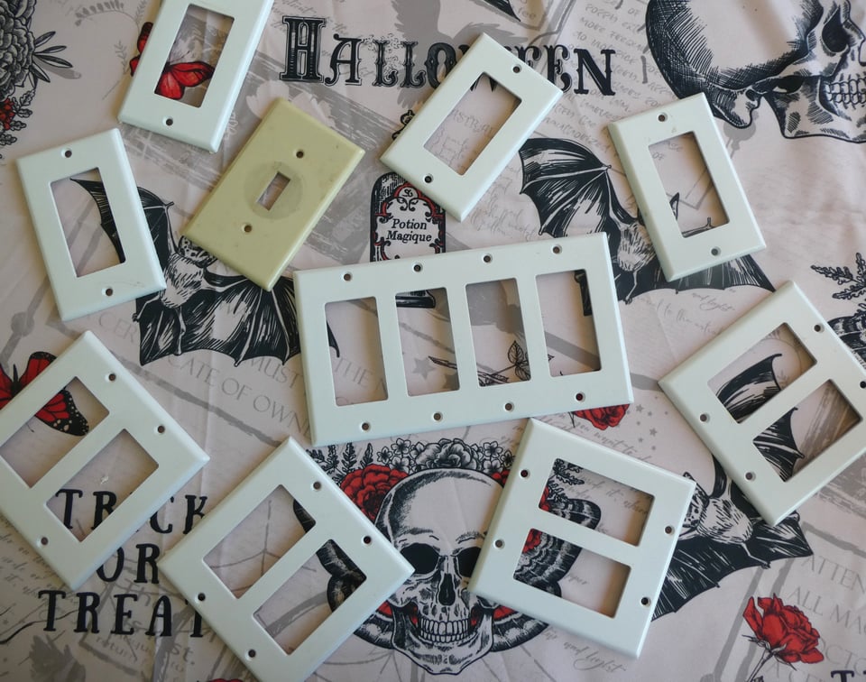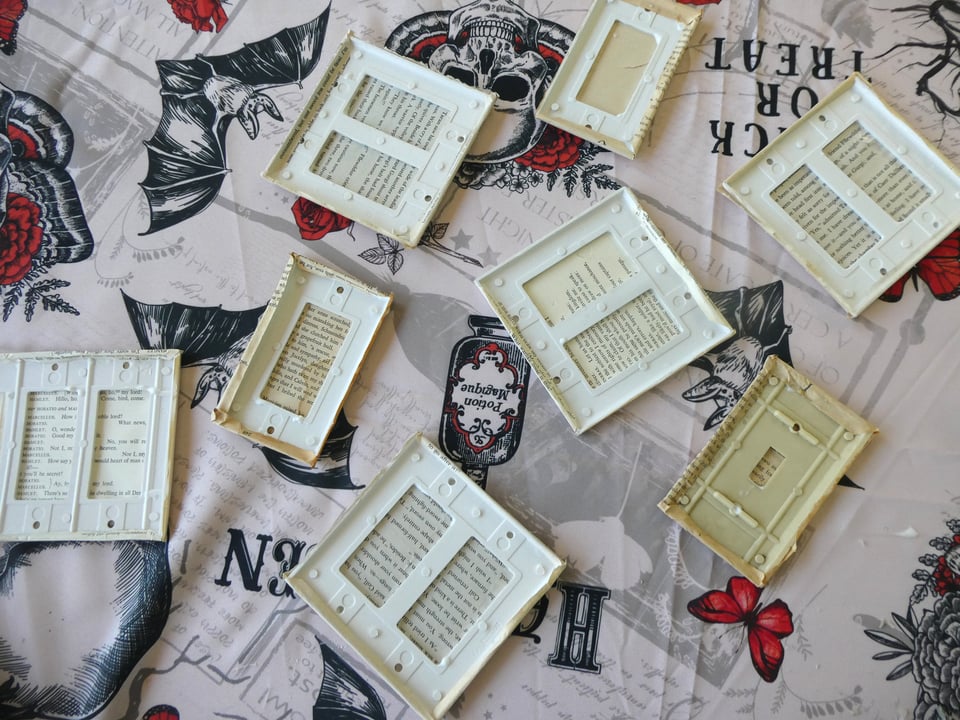 Ultimately, I used three books: spare copies of The Last Unicorn and The Book of Three that I’d picked up at a library book sale and a Hamlet leftover from my old wedding supplies. I knew that for my one quadruple switch plate I’d have to use a two-page spread, and I found that the text of a play looked better for that than prose did.