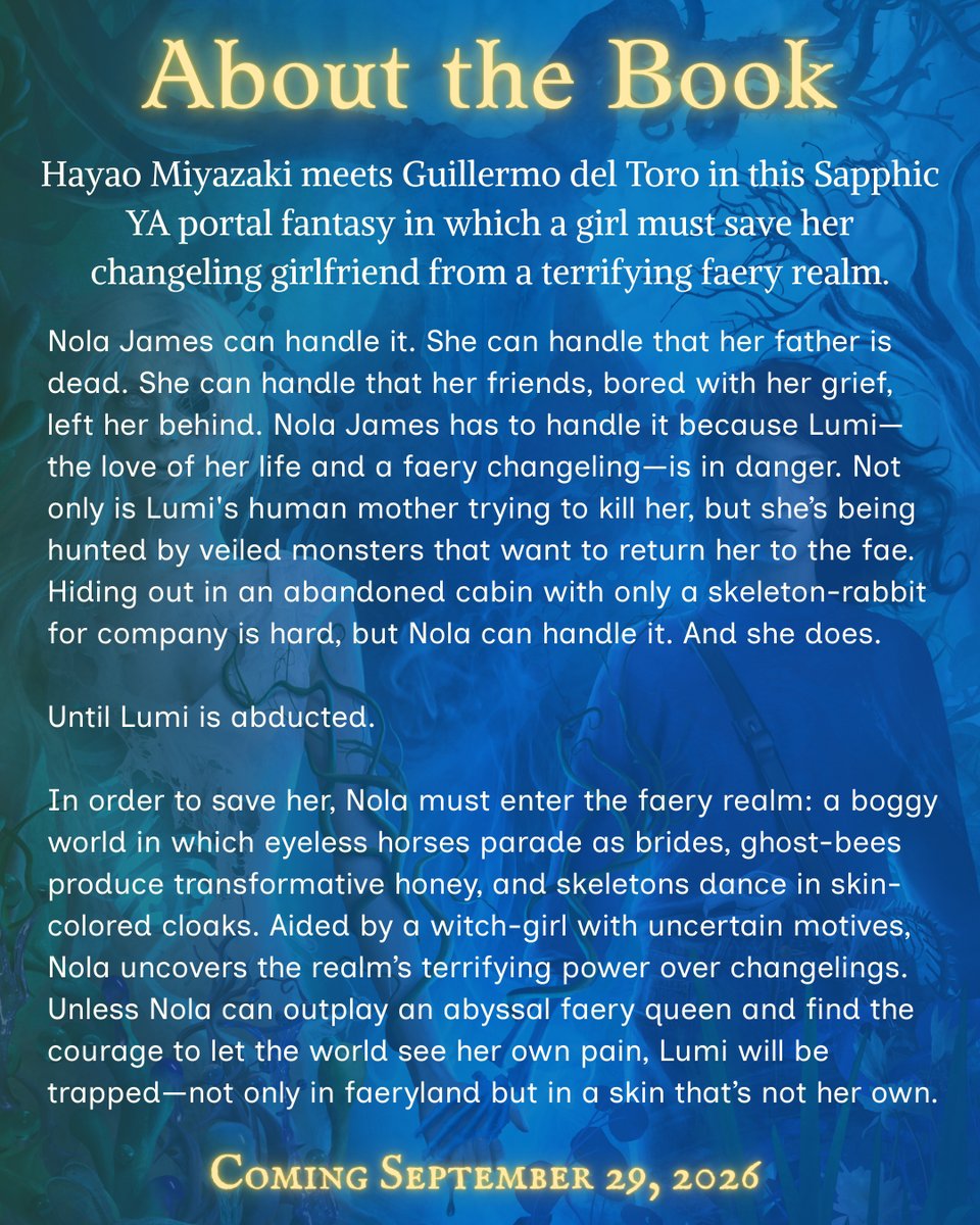 Not in my wildest imaginings did I ever think I would have a cover this beautiful. I mean, LOOK AT IT! Designer Caitlyn Boyd came up with the idea of depicting Nola and Lumi holding hands while facing forward, and I love the strength of their pose—very “us against the world.” These girls endure so much, but through it all, their love for each other is their ballast. No one does spooky-yet-beautiful like artist Marcela Bolívar. Her art is so glowy—much like the luminescent hand prints Lumi leaves on bones—and moody and (in this case) a little sludgy, since the faeryland of the book is a rather wet place. My favorite detail: skeleton-rabbit Jeffrey, in all his squint-and-you-can-almost-pretend-he’s-cute glory. (He IS kind of cute, right? A little?)