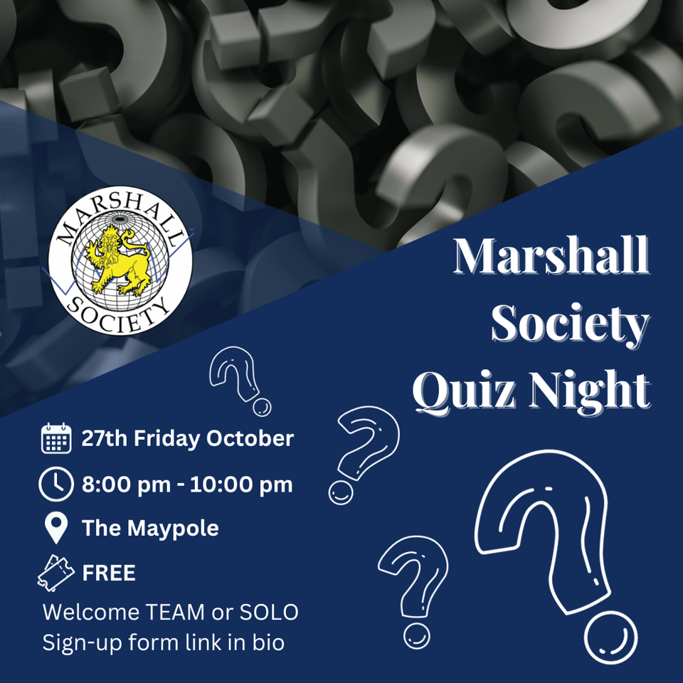 Form your dream team or come solo - everyone’s welcome! Don’t miss this opportunity to test yourself against friends and win exciting prizes! 🥇 Whether you're a world-renowned economics professor or a first-year undergraduate, come and take part in the most rigorous assessment of all, a Marshall Society Quiz!