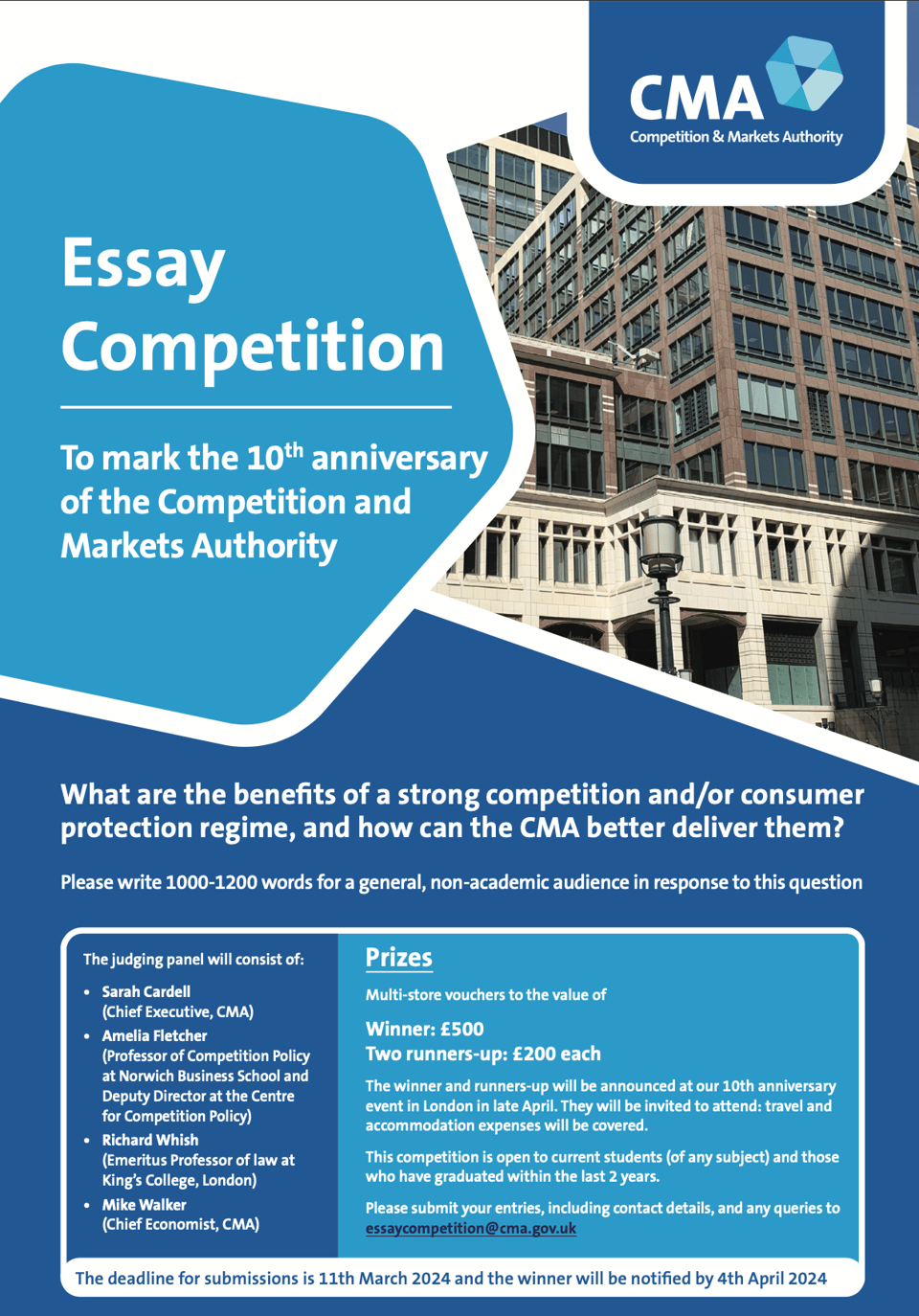 They are asking entrants to submit a 1000-1200 word essay, which will be judged by an expert panel (including Sarah Cardell, the CEO of the CMA). The winner will receive £450 and will be invited to attend our 10th anniversary celebration in London, with travel and accommodation expenses covered. Additionally, the two runners-up will each receive £150.