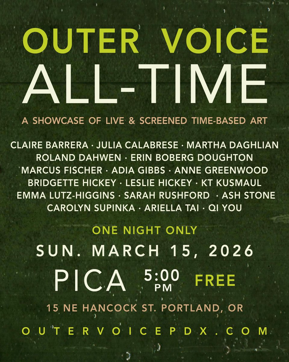 Please join us for an exciting evening of live and screened time-based art by Outer Voice 2024, 2025, and 2026; the current and past alliance cohorts! The program will consist of a variety of short contemporary art works in video, music, audio, dance, performance art, and more.