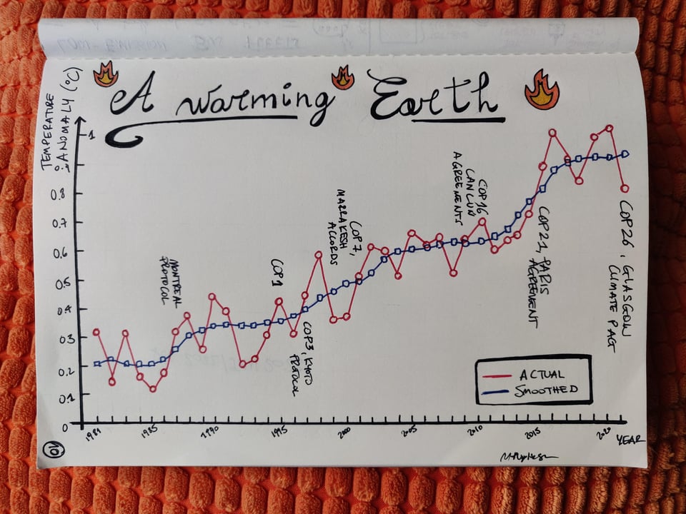 The viz shows the global temperature anomaly from 1981 onwards (last data point for 2021). The temperature anomaly is defined as the difference in surface temperature between a given year and the long-term mean of the period 1951-1980, which is why I’ve decided to report this value only from 1981 onwards. Data is from NASA, you can see the whole timeseries on their website. The “10“ on the bottom-left corner refers to the fact that this is my 10th data card on climate change (I have a special notebook for them), you will see the other ones in due time.