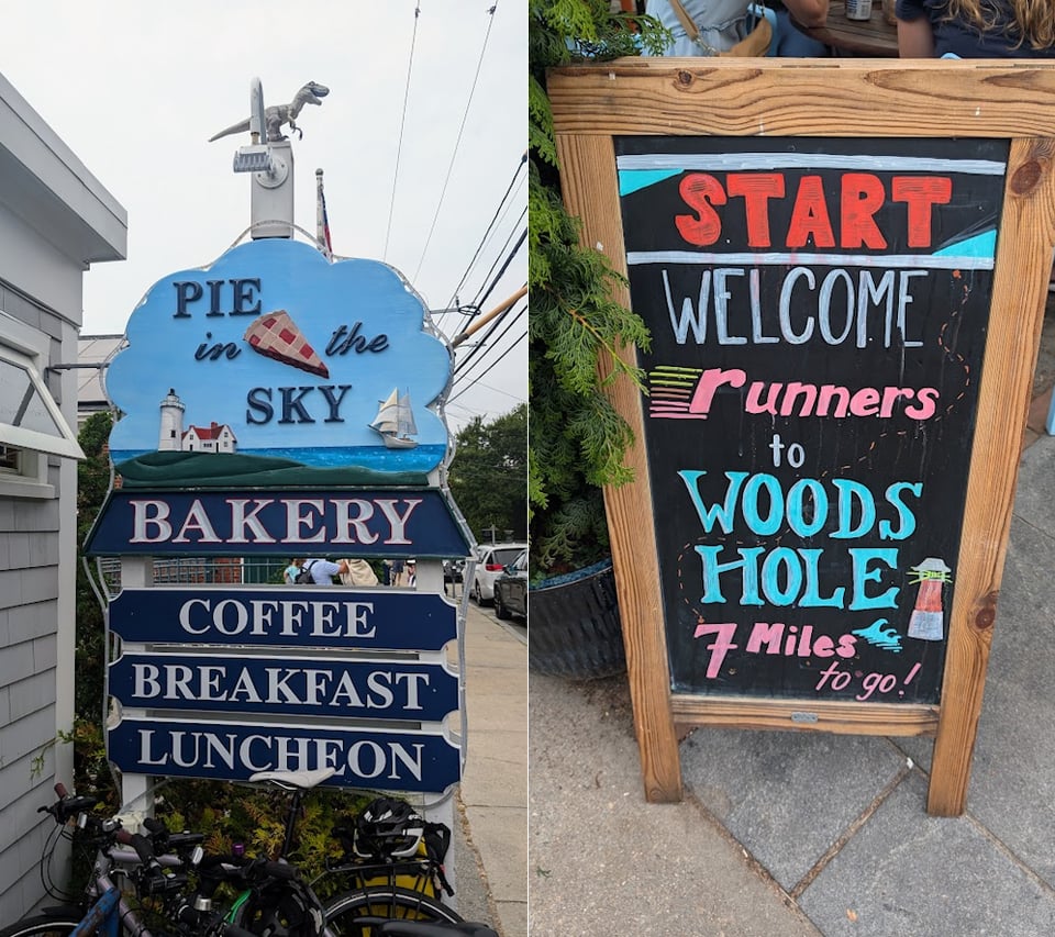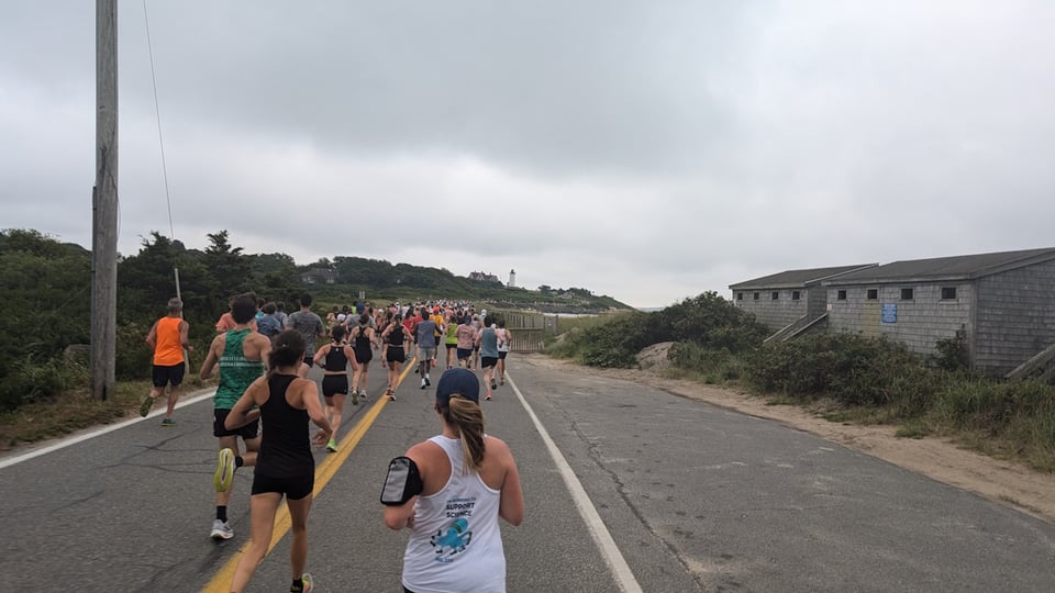 It was overcast and a little warm, but nothing like it had been all summer; the humidity was more the thing than anything else. And holy cow, there were a lot of people! Apparently a little over 11k runners took part, and while this sort of turnout at, say, the Baltimore Running Fest wouldn’t have been unreasonable, on the tiny narrow streets of Woods Hole and Falmouth, it felt densely packed the entire 7 miles. Which I didn’t mind! And the crowds were out in force. I loved that our bibs all had our names in big letters, so spectators would often call you out by name with encouragement if they saw you struggling. The folks who cheered me on for the last big hill going into the finish line were heroes.