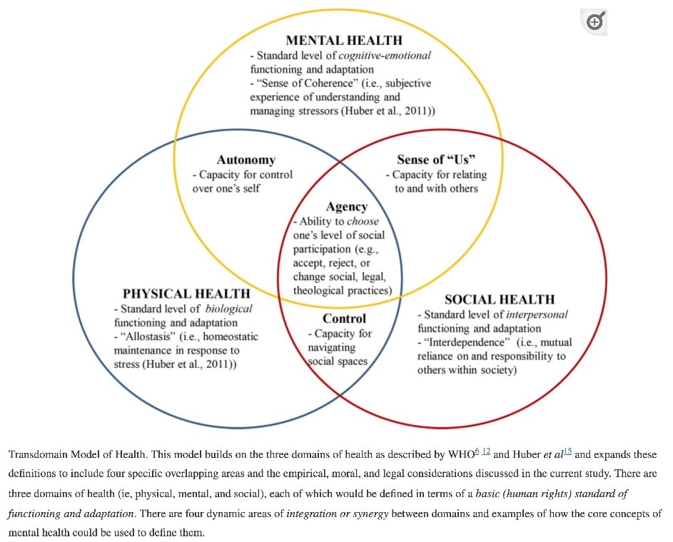 Let’s take a look at the last figure from the paper What is mental health? Evidence towards a new definition from a mixed methods multidisciplinary international survey. The authors call this the Transdomain Model of Health: