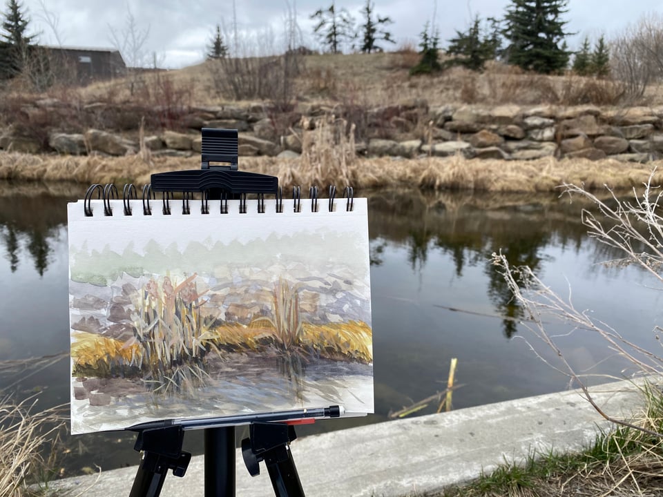 The average temperature in Calgary for April was 4.3°C and most of the plants and grasses were still various shades of dead and brown, but I still managed to get outside and do some painting, like three or four days worth …