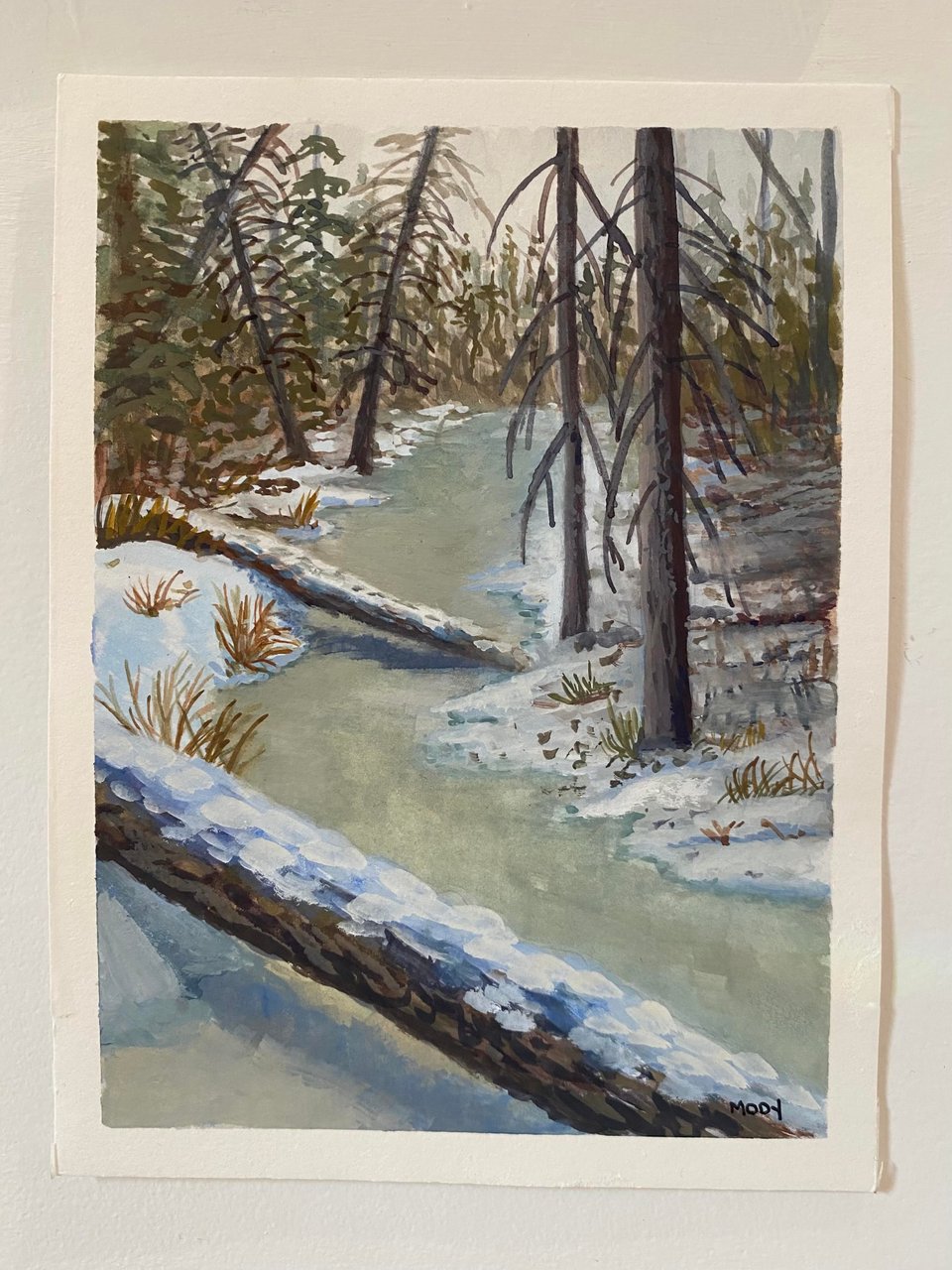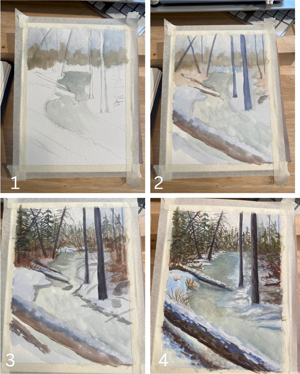 Here are a series of steps towards a little gouache painting I recently completed. The original image was taken in Fish Creek and I chose to paint it because I was enamoured with the hue of the ice.