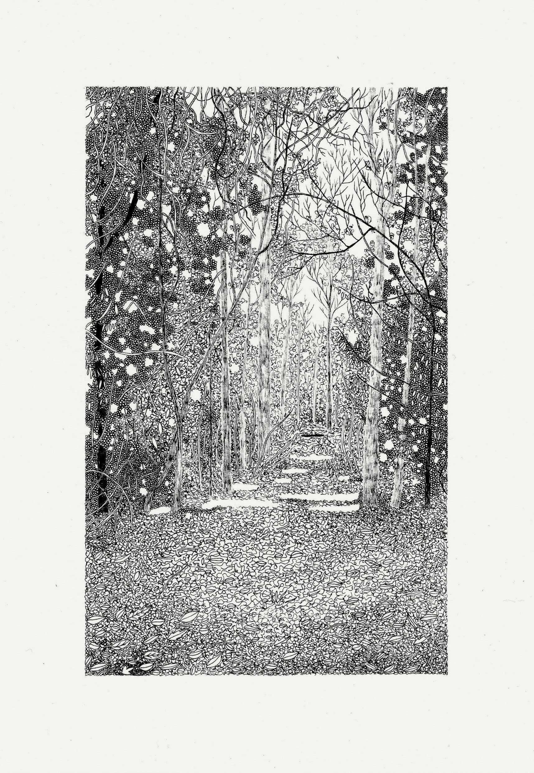 Also wonderful tiny, the woodland drawings of Hampshire-based artist Claire Leach caught my eye this week. The texture she builds up with a foam of lines is stunning, but it’s those areas of white bursting through the leaves that really strike me. Which reminds me of …