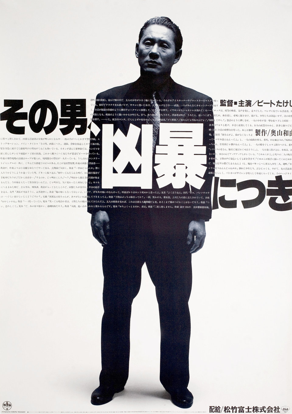Not sure who the designer is, but I’m loving the bold simplicity of this 1989 poster for Takeshi Kitano’s Violent Cop. No violence, no action, just an expressionless (yet menacing) portrait of Kitano. Visually it’s strong, but it’s the type that really impresses – contrast reversed, fully justified text, no massive gaps and presumably no jarring line breaks in the credits. That’s hard.